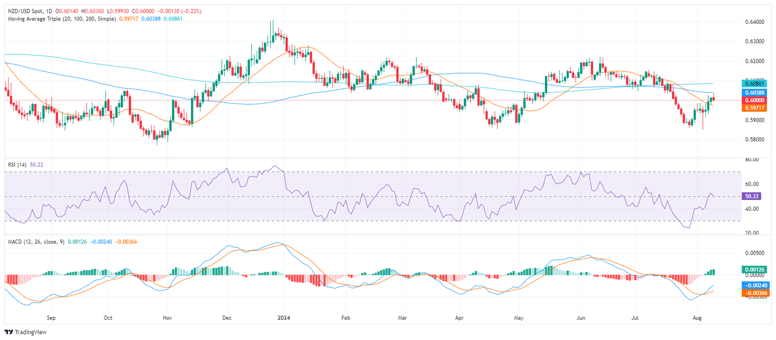 In Friday's session, the NZD/USD pair declined mildly to 0.6010, marking the seventh consecutive day within a narrow range. The technical readings suggest that the pair remains in a consolidative phase, with bulls struggling to push above 0.6000 and bears keeping the downside limited.