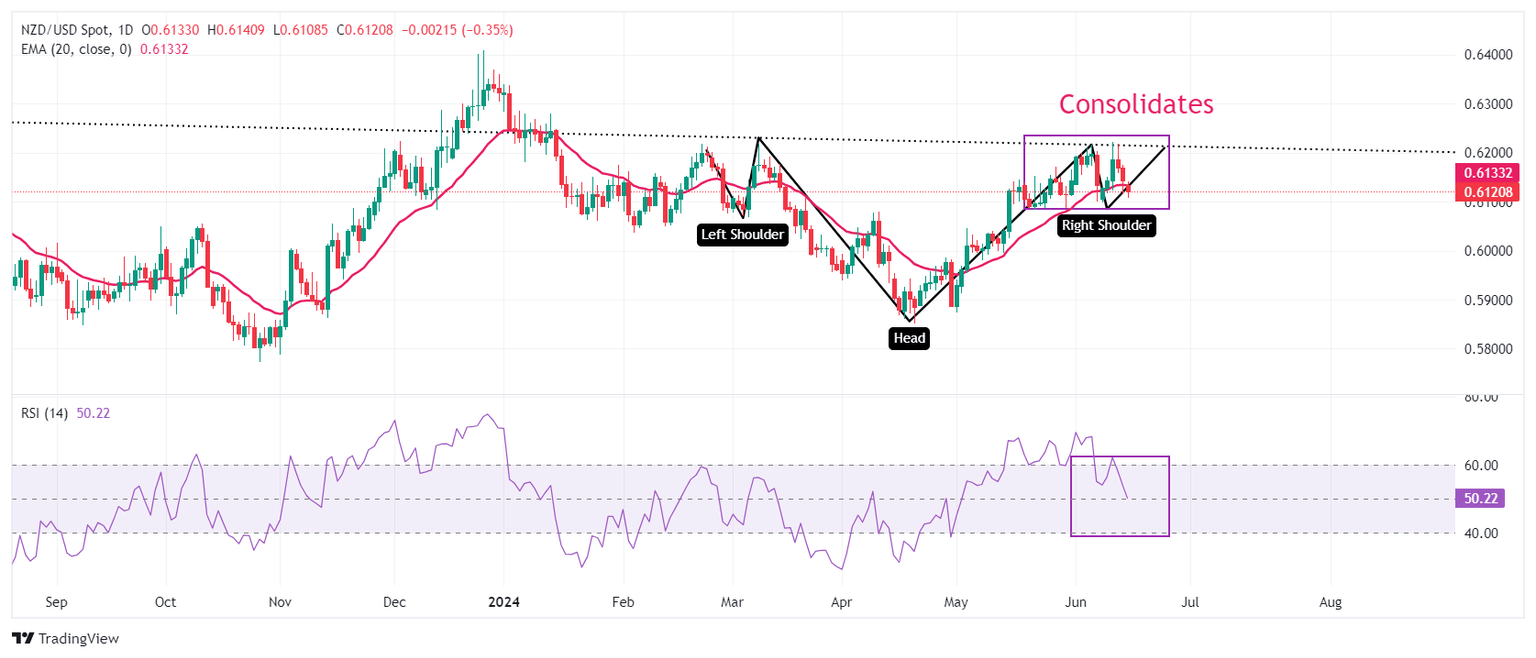 NZD/USD declines while attempting to deliver a breakout of the Inverted Head and Shoulder (H&S) chart pattern formed on a daily timeframe. The neckline of the above-mentioned chart pattern is marked near 0.6215. The asset has declined below the 20-day Exponential Moving Average (EMA) near 0.6130, which indicates an uncertain near-term outlook.