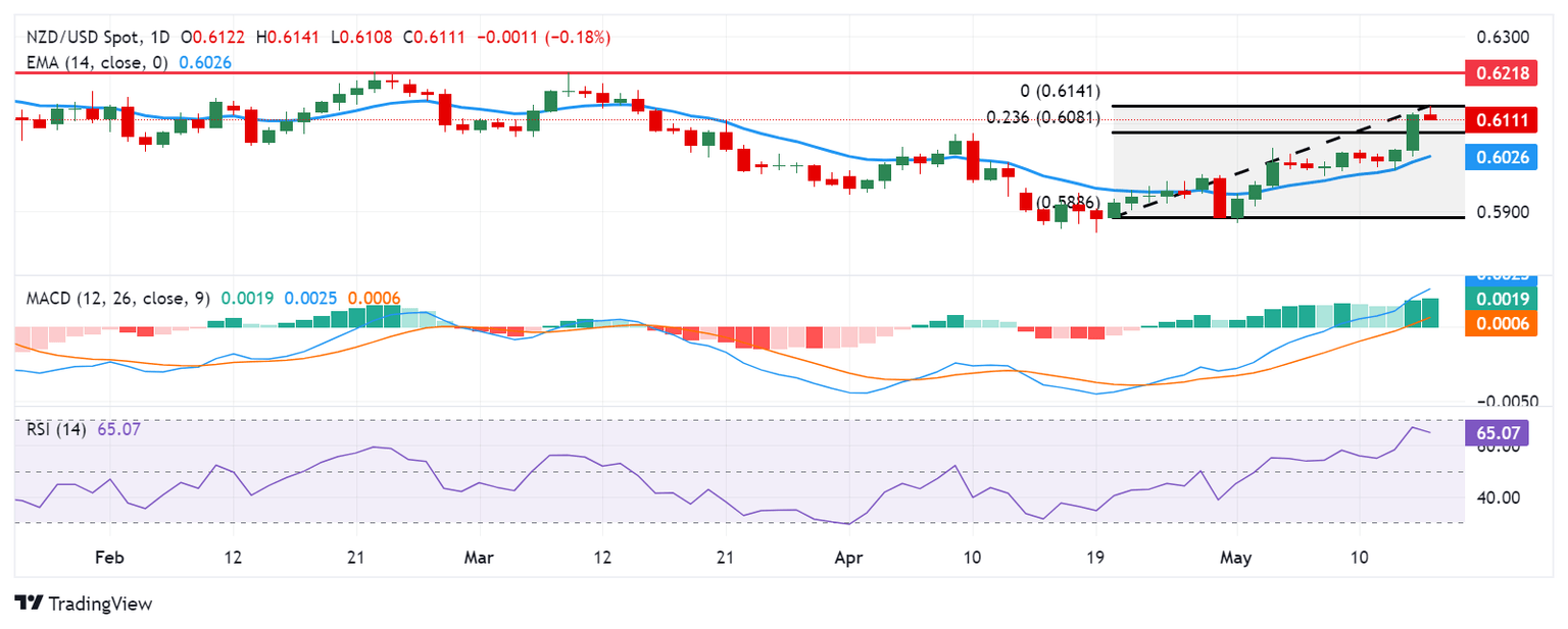 On the downside, the psychological level of 0.6100 could act as the immediate support, followed by the 23.6% Fibonacci retracement level of 0.6081, plotting within coordinates of 0.5886 and 0.6141. A break below the latter could prompt the NZD/USD pair to navigate the region around the 14-day Exponential Moving Average (EMA) at 0.6026.