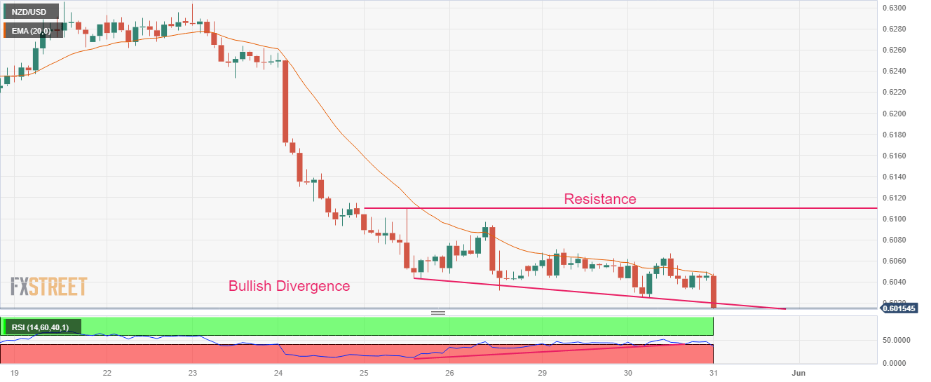 NZD/USD has formed a Bullish Divergence on a two-hour scale, which indicates exhaustion in the downside momentum. The Kiwi asset was consistently making lower lows while the momentum oscillator Relative Strength Index (RSI) (14) made higher lows. The bullish divergence would get triggered after a decisive break above the crucial resistance of 0.6070.