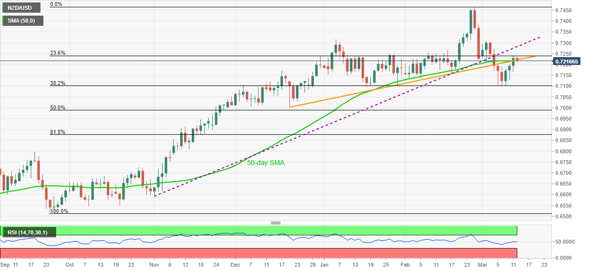 NZD/USD alternates gains with losses, drops 0.18% to 0.7217, during early Friday. The kiwi pair initially rose towards the weekly top before taking a U-turn from 0.7234. In doing so, the quote wavers around the previous support line from late December 2020 and 50-day SMA.