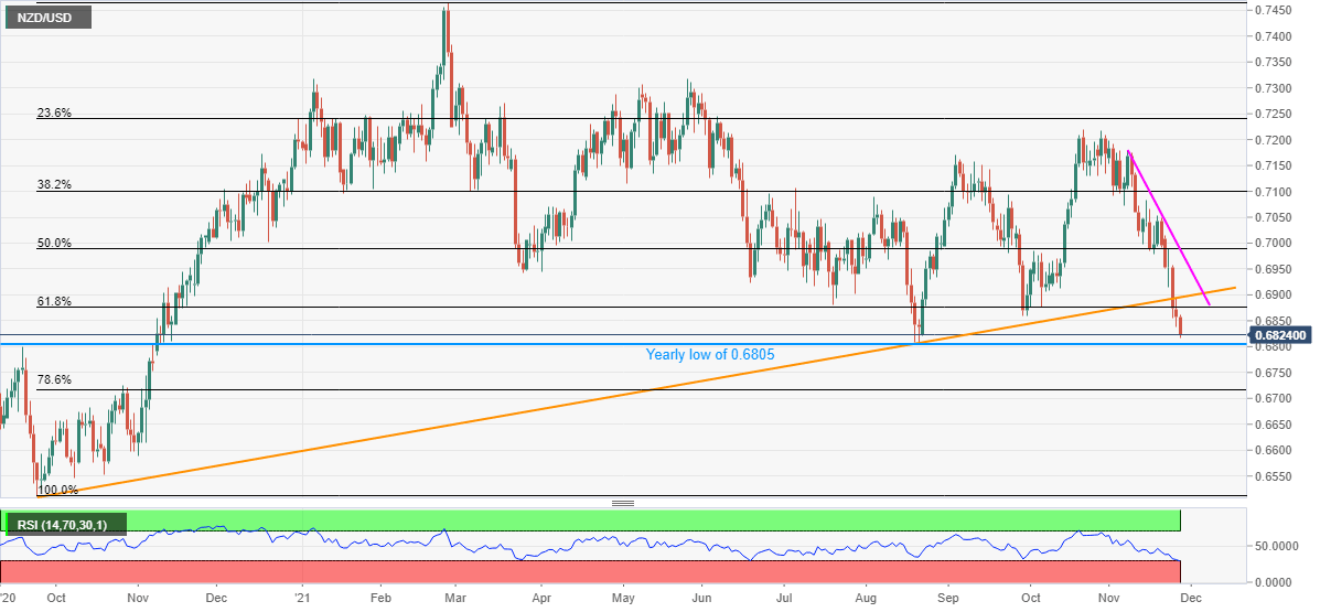 Having conquered a 14-month-old support line, NZD/USD bears smashed 61.8% Fibonacci retracement (Fibo.) of September 2020 to February 2021 upside, which in turn suggests the quote’s further weakness towards the yearly bottom of 0.6805.