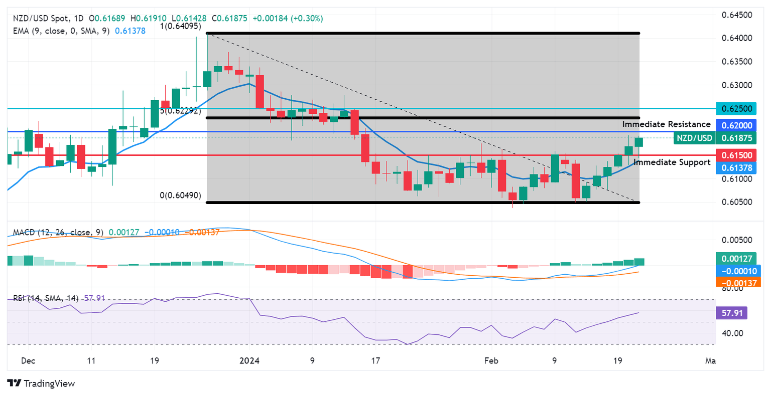NZD/USD continues to extend its winning streak that began on February 14 on the subdued US Dollar, which could be chalked up to the lower US Treasury yields. The NZD/USD pair rises to near 0.6190 during the Asian trading hours on Wednesday.