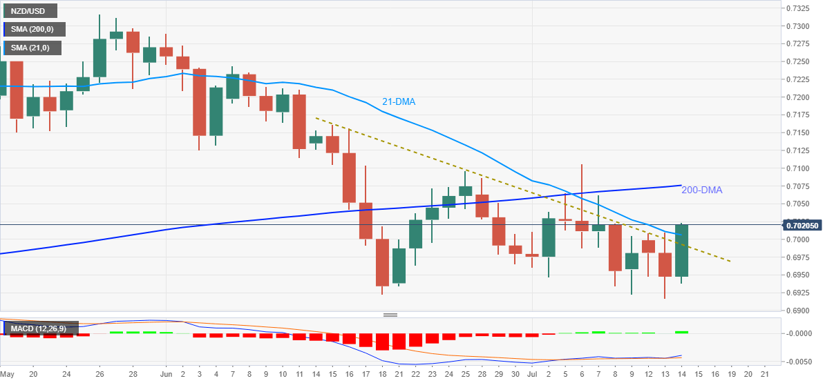 Bullish MACD signals back the breakout but a daily closing beyond 0.7005 will be needed for the NZD/USD buyers to mark another battle with the key 200-DMA hurdle around 0.7075.