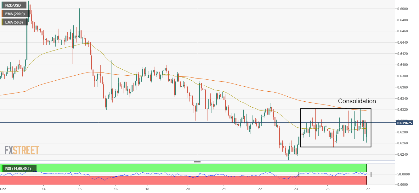 On an hourly scale, the Kiwi asset is oscillating back and forth in a range of 0.6253-0.6322 as investors are awaiting a fresh trigger for a decisive move ahead. Also, a volatility contraction is bolstering expectations for an expansion in tick size and volume ahead. The 50-period Exponential Moving Average (EMA) at 0.6300 is overlapping with the asset, which indicates a consolidation while the 200-EMA at 0.6320 is acting as a major barricade for the asset.