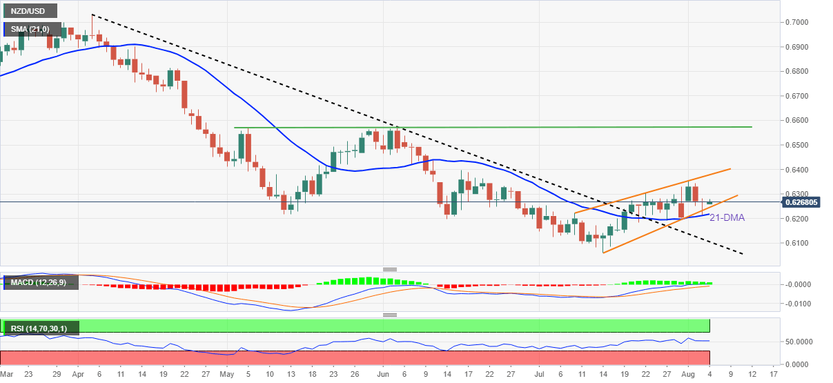 NZD/USD retreats towards 0.6250, fading the bounce off 21-DMA inside a one-month-old rising wedge bearish pattern amid Thursday’s initial Asian session.