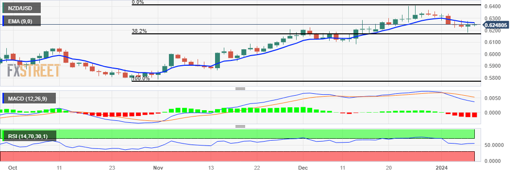 NZD/USD Price Analysis: Finds key resistance support near 0.6250 before nine-day EMA