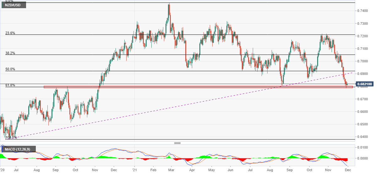 Technically, bears cheer a sustained trading below the 17-month-old support line, now resistance around 0.6900. However, the 61.8% Fibonacci retracement (Fibo.) level of June 2020 to February 2021 upside and multiple levels marked during September and November 2020 provide a tough nut to crack for the bears around 0.6800-6790 area.