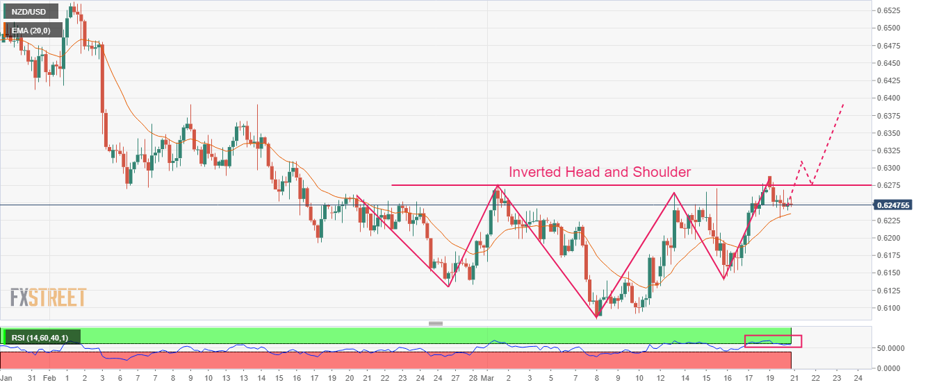 NZD/USD is forming an Inverted Head and Shoulder chart pattern on a four-hour scale. The chart pattern displays a prolonged consolidation and results in a bullish reversal after a breakout of the neckline, which is plotted from the March 01 high at 0.6276.