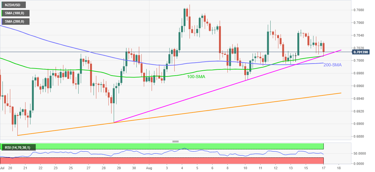 The kiwi pair’s latest bounce could be linked to the failures to conquer a confluence of 100-SMA and an ascending trend line from July 28, near 0.7005.