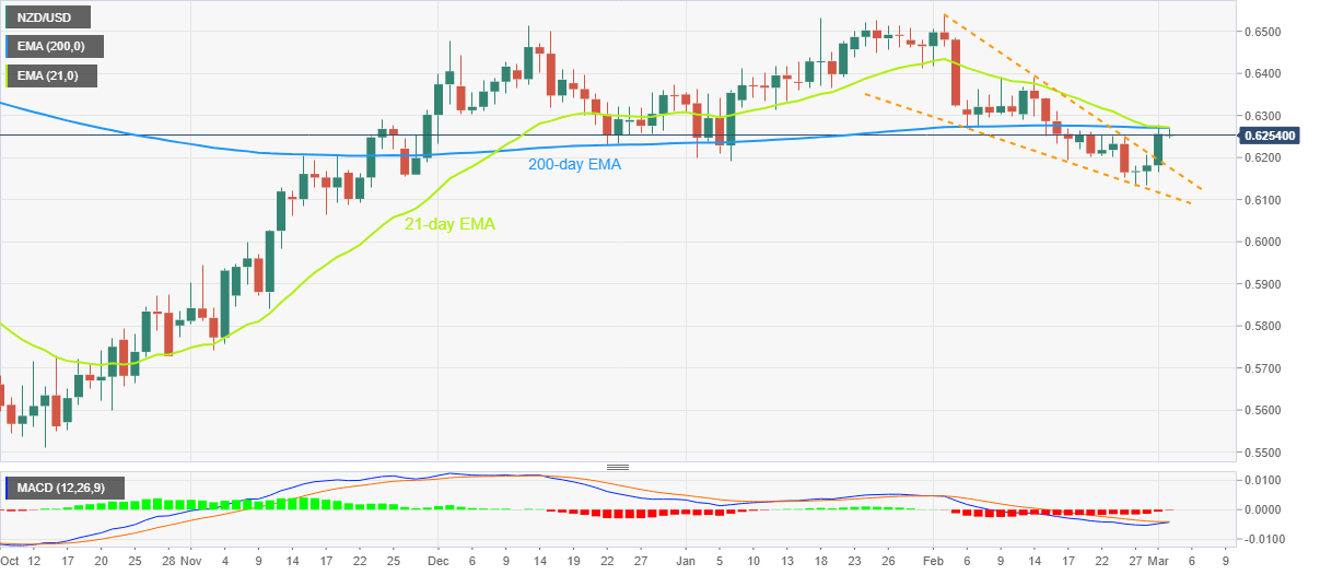 NZD/USD bulls struggle to justify the falling wedge breakout as the key moving averages challenge upside near the mid-0.6200s during early Thursday. However, the impending bull cross on the MACD indicator keeps the Kiwi pair buyers hopeful, especially after the confirmation of the bullish chart pattern the previous day.