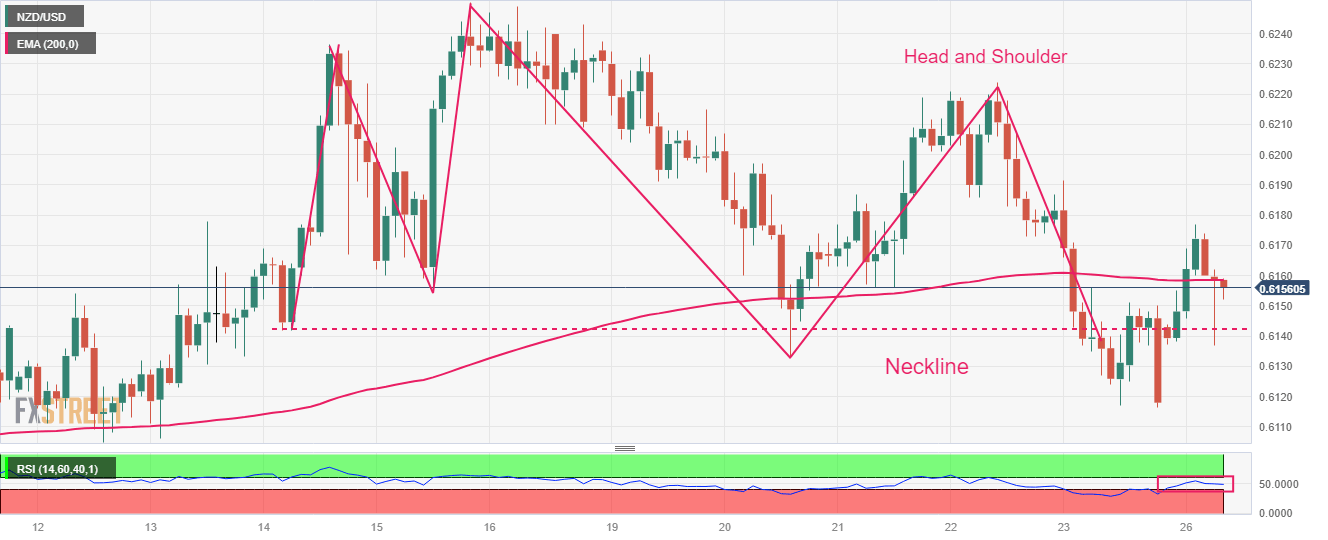 The Kiwi asset is struggling to maintain an auction above the 200-period Exponential Moving Average (EMA) at 0.6159, which indicates that the long-term trend is not bullish.