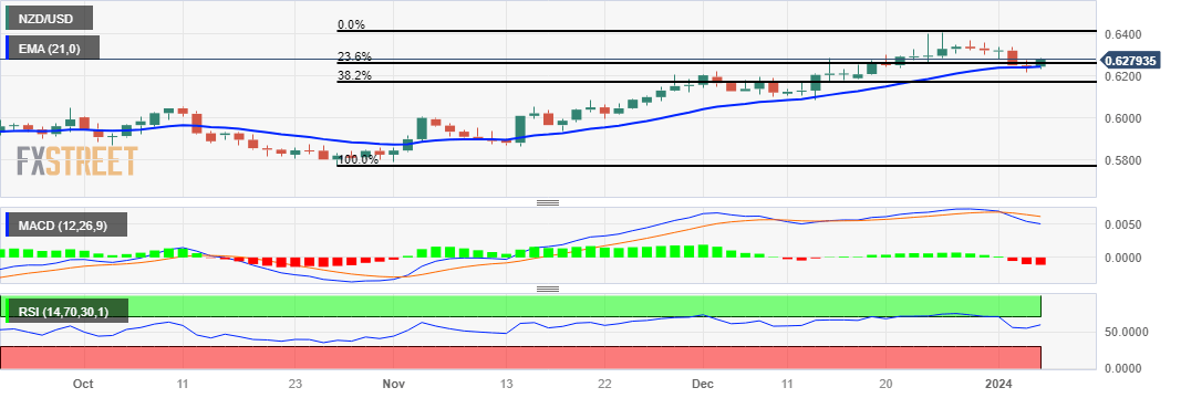 On the downside, the 23.6% Fibonacci retracement at 0.6260 appears as the immediate support followed by the major level at 0.6250 and the 21-day Exponential Moving Average (EMA) at 0.6244. A break below this support zone could influence the bears of the NZD/USD pair to test the psychological support at 0.6200 following the 38.2% Fibonacci retracement at 0.6167 level.