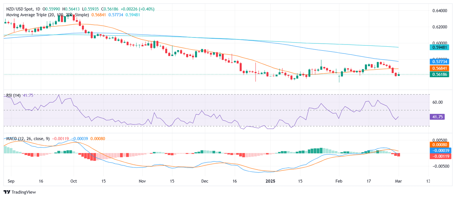 NZD/USD posted a mild gain on Monday after a prolonged losing streak, as the pair found some stability following its recent sell-off. Despite the brief upside move, the broader trend remains bearish, with the pair trading well below the 20-day Simple Moving Average (SMA). The downtrend has been reinforced by technical signals, suggesting that any bullish attempt might face strong resistance.