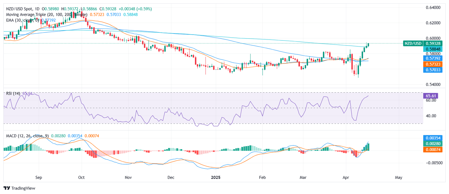 The NZD/USD pair advanced for a third session on Wednesday, holding near the 0.5900 region ahead of the Asian session. The pair saw modest gains and remained confined within a relatively tight range between 0.58865 and 0.59308, suggesting a steady bullish tone.