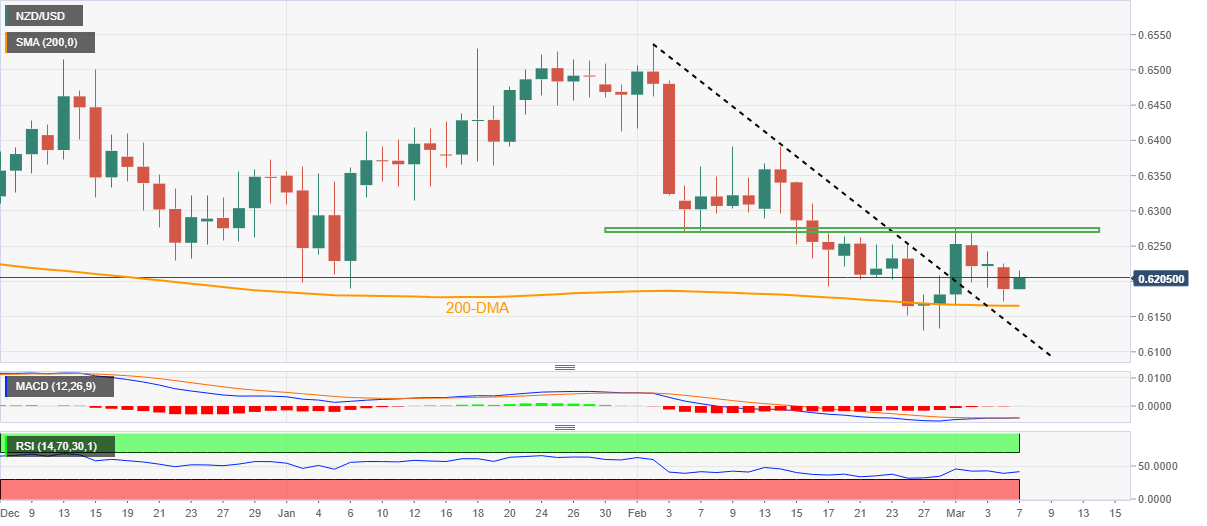 NZD/USD seesaws around intraday high near 0.6210, up 0.40% on a day, as bulls cheer the previous day’s inability to conquer the 200-DMA support amid early Tuesday. In doing so, the Kiwi pair buyers also benefit from the upbeat oscillators while heading into a short-term key resistance.