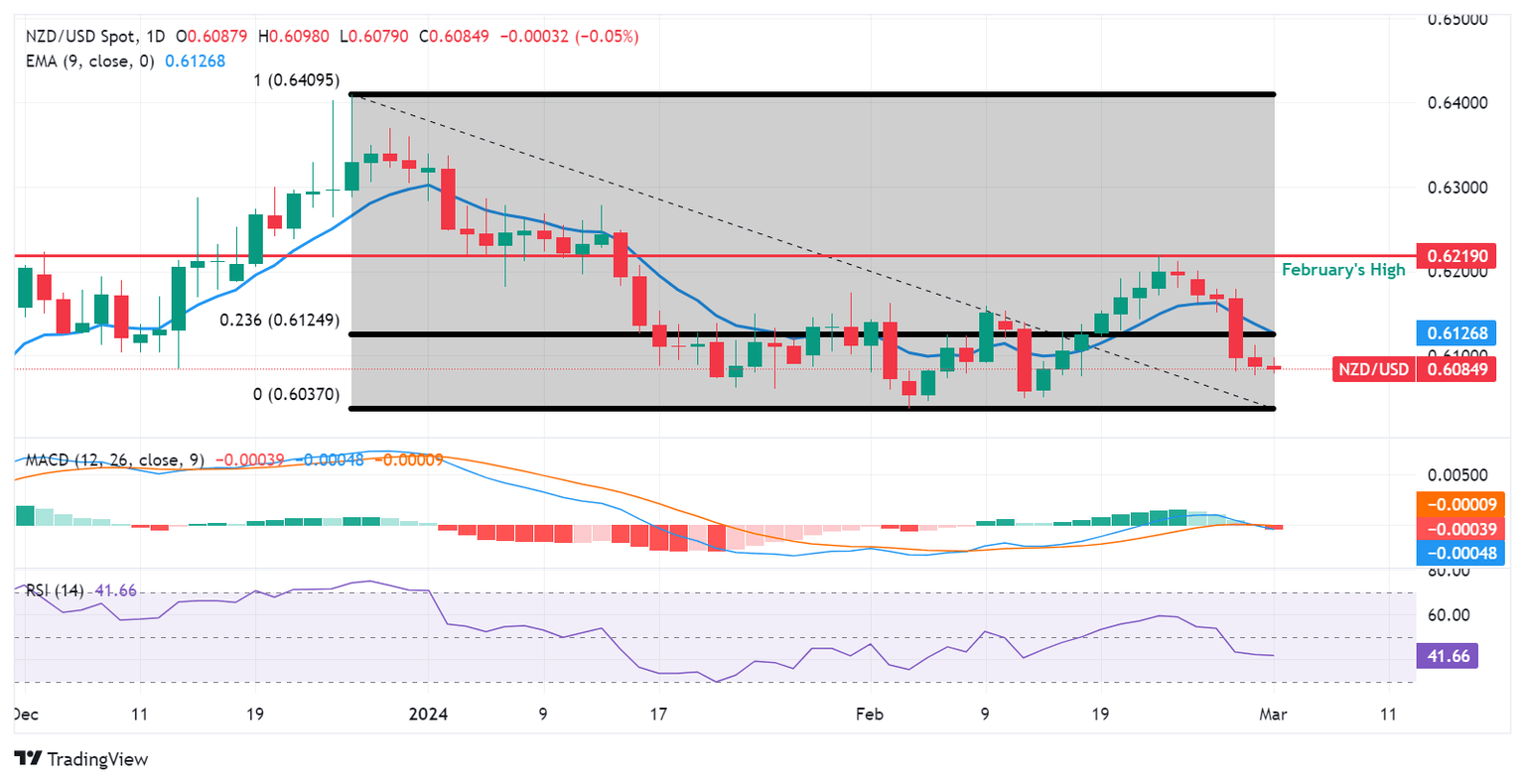 NZD/USD moves sideways with a bias to continue its losing streak that began on February 23. The pair hovers around 0.6090 during the European session on Friday, positioned just below the immediate resistance of the psychological level at 0.6100.