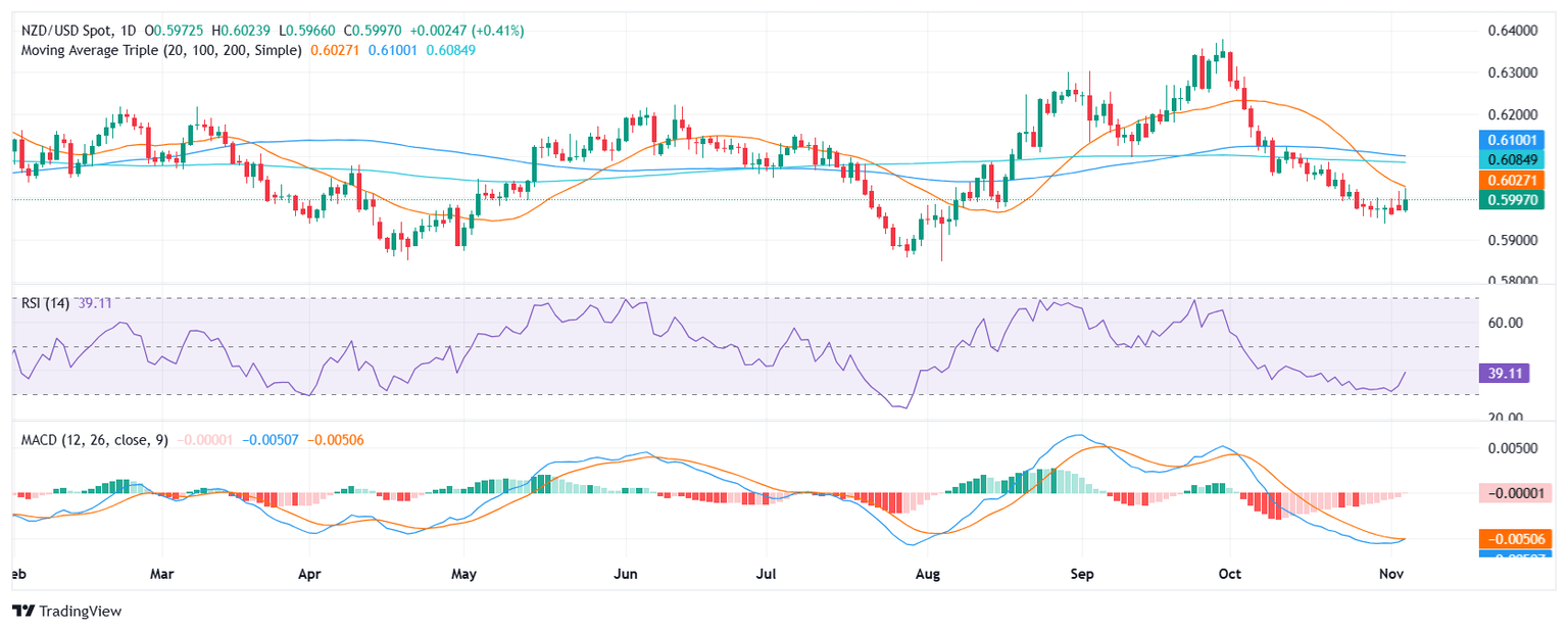 The NZD/USD pair has resumed its choppy movement, with a an upward bias, after a brief dip below the 0.6000 support. The pair is currently trading around 0.5994, facing resistance at the 20-period Simple Moving Average (SMA), which has capped further gains in recent sessions.