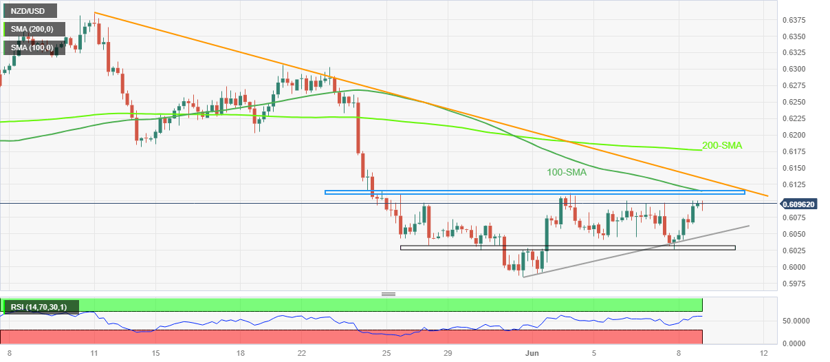 On the contrary, the aforementioned one-week-old rising trend line, near 0.6050 at the latest, restricts the immediate downside of the NZD/USD pair.