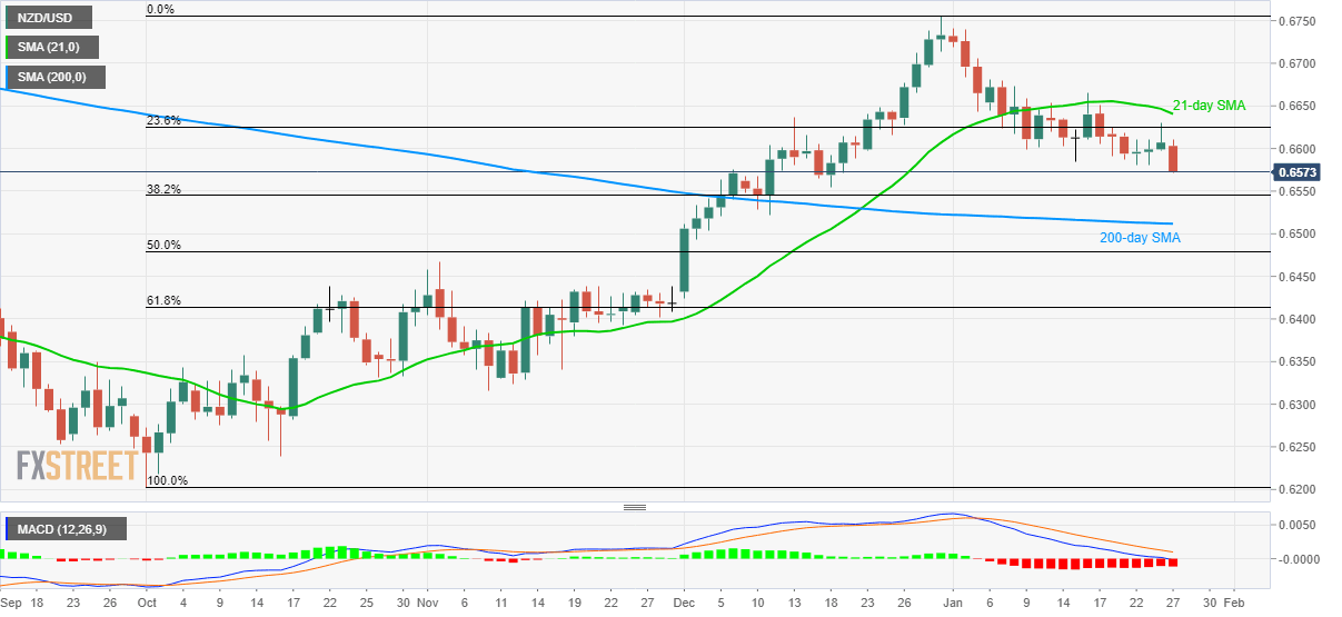 NZD/USD declines to the fresh multi-week low while flashing 0.6572 as the quote during early Monday. The pair failed to extend its latest recovery beyond 23.6% Fibonacci retracement of its October-December 2019 upside.