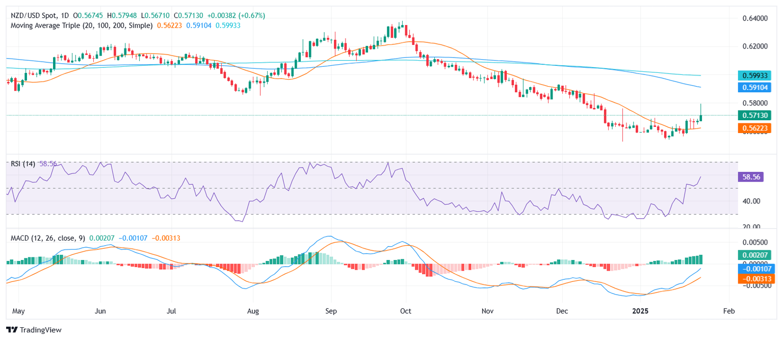 The NZD/USD pair continued its upward trajectory on Friday, rising by 0.44% to settle at 0.5705 and mantains its footing above its 20-day Simple Moving Average (SMA). This marks a steady continuation of the bullish momentum observed since mid-January, which was initiated by a breakout above the 0.5600 level. While minor pullbacks earlier in the week reflected potential profit-taking, the pair has maintained its position above 0.5700, signaling strong buying interest. On the negative side, the pair failed to sustain its intraday push near 0.5800.