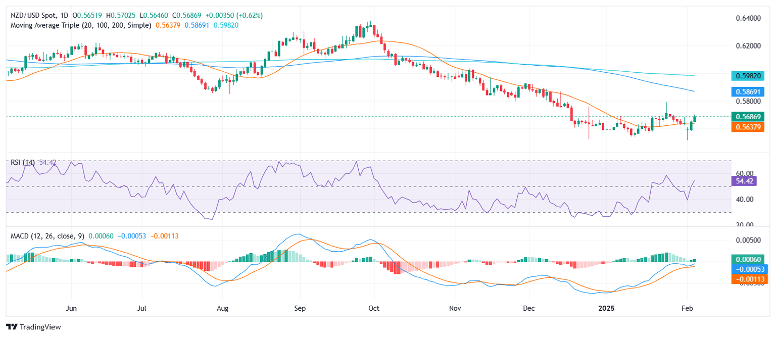 The NZD/USD pair extended its winning streak on Wednesday, posting a 0.67% gain to reach 0.5685. This upward move follows a breakout above the 20-day Simple Moving Average (SMA), which now acts as a key support level. The bullish sentiment appears to be strengthening, with the pair eyeing further gains toward the 0.5700 psychological threshold.