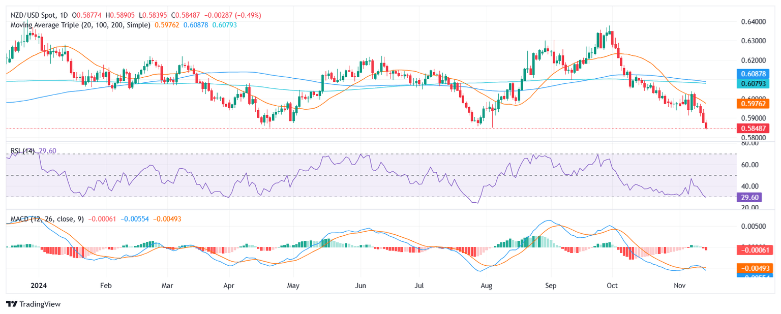 The NZD/USD pair declined by 0.65% during Thursday's session and fell below the 0.5900 mark, extending declines for the sixth day and hitting lows since November 2023. The bearish momentum escalated and oversold signals emerged.