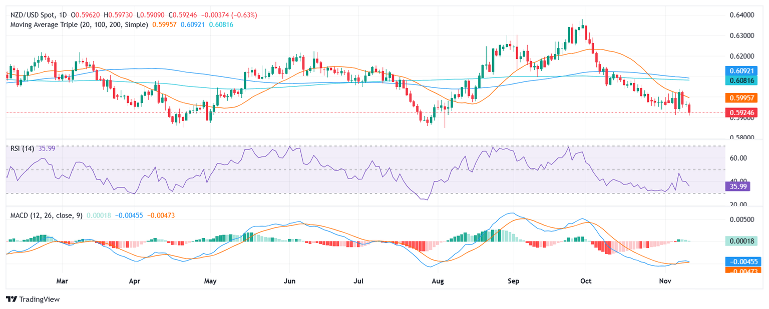 The Relative Strength Index (RSI) is approaching oversold territory near 30, suggesting that selling pressure is rising. Meanwhile, the Moving Average Convergence Divergence (MACD) indicates that buying pressure is declining, giving more evidence of a bullish weakness. The recent technical analysis of the NZD/USD pair suggests that the downtrend could continue, but mixed signals are present, indicating a potential for a recovery due to the oversold nature of the RSI.