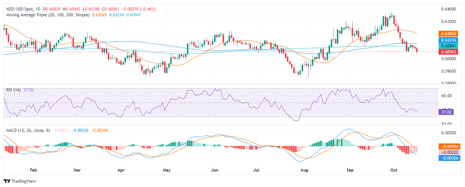 In Wednesday's session, the NZD/USD extended its recent decline, falling by 0.27% to 0.6050. The technical indicators remain bearish, indicating a continuation of the selling pressure that has dominated recent trading sessions.