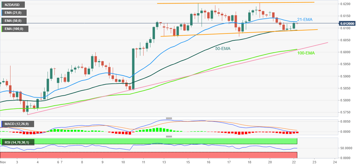 NZD/USD retreats from intraday high to 0.6115 heading into Tuesday’s European session. In doing so, the Kiwi pair reverses from the 21-bar Exponential Moving Average (EMA).