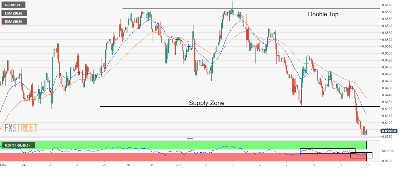 On an hourly scale, the kiwi bulls have witnessed a steep fall after a Double Top formation that dictates a weak attempt of surpassing previous highs. The greenback bulls have dragged the asset below 0.6400 after violating the supply zone, which is placed in a narrow range of 0.6420-0.6423.