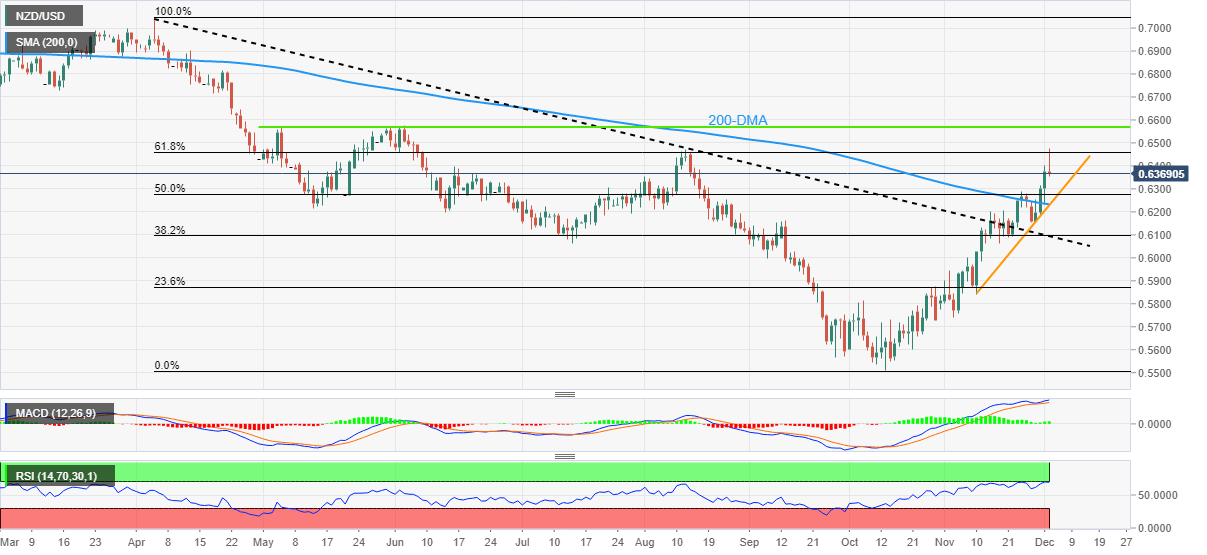 In doing so, the Kiwi pair retreats from the 61.8% Fibonacci retracement level of the pair’s April-October moves, near 0.6460, amid the overbought RSI (14).