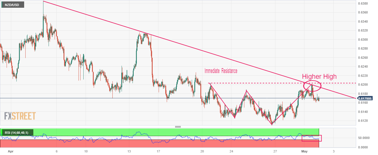 The NZD/USD pair has scaled sharply above the immediate resistance of 0.6170 in the early Tokyo session. Earlier, the Kiwi asset witnessed an intense sell-off on Monday after failing to claim the round-level resistance of 0.6200.