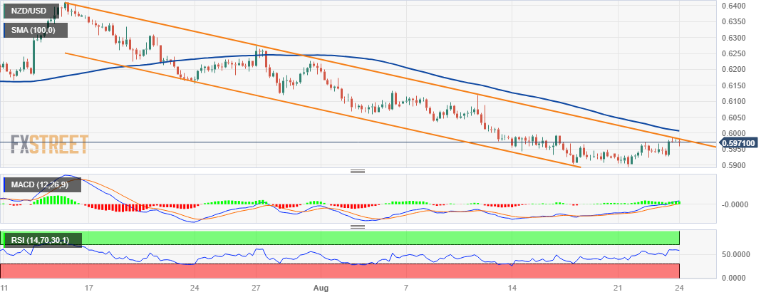 From a technical perspective, the recent recovery from sub-0.5900 levels, or a fresh low since November 2022 touched last week, fails near a resistance marked by the top boundary of over a one-month-old descending channel. The said barrier, currently around the 0.5985 region, is closely followed by the 0.6000 psychological mark, or the 100-period Simple Moving Average (SMA) on the 4-hour chart, which should act as a pivotal point and help determine the near-term trajectory for the NZD/USD pair.