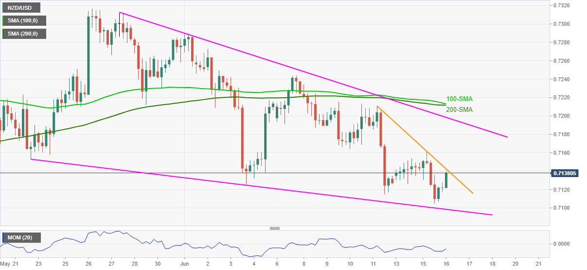 NZD/USD remains well bid near the intraday top of 0.7140, up 0.23% on a day, during early Wednesday. The kiwi pair dropped to the fresh low since April 14 the previous day before bouncing off 0.7105.
