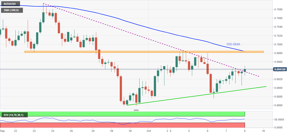 Meanwhile, pullback moves will initially be challenged by the previous resistance line near 0.6935 before directing NZD/USD sellers towards an ascending support line from September 29, close to 0.6900.