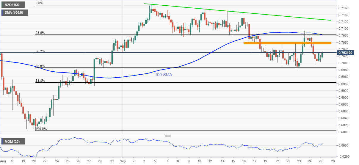 NZD/USD reverses Friday’s downside while picking up the bids to refresh intraday top near 0.7035 during early Monday.