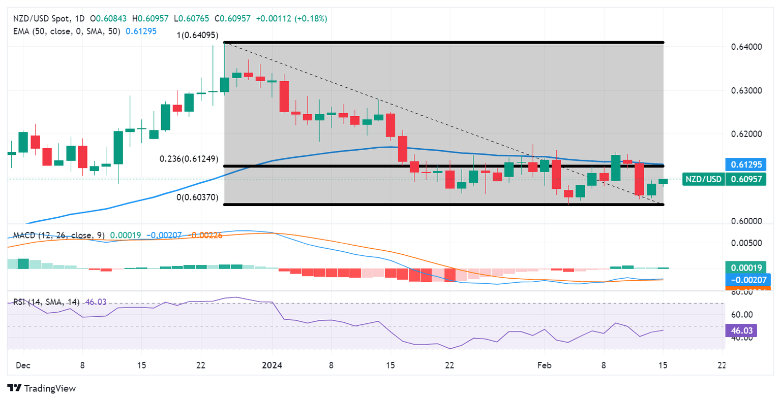 The immediate resistance appears at the psychological level of 0.6100. A breakthrough above this psychological level could inspire the NZD/USD pair to approach the resistance zone around the 23.6% Fibonacci retracement level of 0.6124 aligned with the 50-day Exponential Moving Average (EMA) at 0.6129.