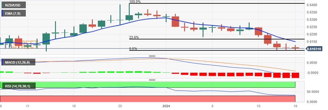 NZD/USD continues its losing streak for the fifth straight session, trading lower near 0.6110 during the European session on Friday. The Business NZ Performance of Manufacturing Index (PMI) disclosed a decline in business activity within New Zealand's manufacturing sector, registering a figure of 43.1 in December compared to the previous reading of 46.5. This softer-than-expected result exerted downward pressure on the New Zealand Dollar (NZD), subsequently impacting the NZD/USD pair.