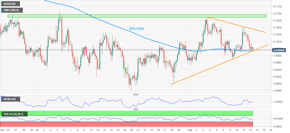 NZD/USD takes offers around 0.6996, down 0.10% intraday, amid early Friday. In doing so, the kiwi pair fades the previous day’s bounce off 200-SMA as sellers battle the key support convergence including the stated moving average and an ascending support line from July 28.