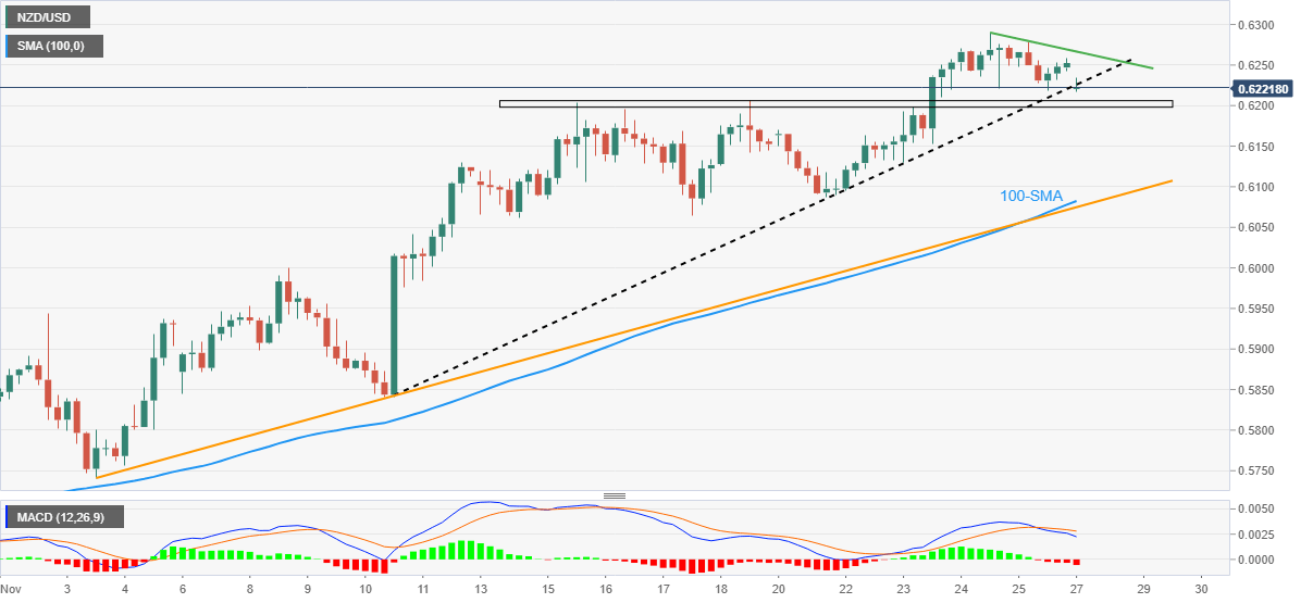 In a case where the quote breaks the 0.6200 key support, the odds of witnessing a slump toward the 100-SMA level surrounding 0.6080 can’t be ruled out. Even so, an upward-sloping support line from November 04, close to 0.6075 by the press time, could probe the NZD/USD bears afterward.