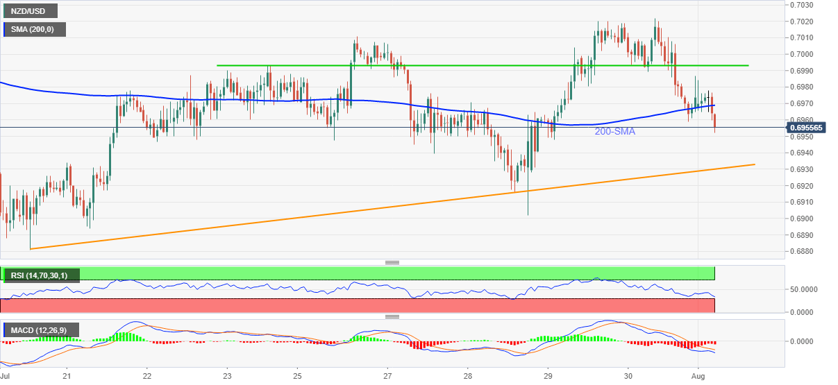 The quote’s drop below 200-HMA amid bearish MACD signals and downward sloping RSI line, not oversold, also justify the downbeat fundamentals, suggesting further weakness towards a short-term support line near 0.6930.