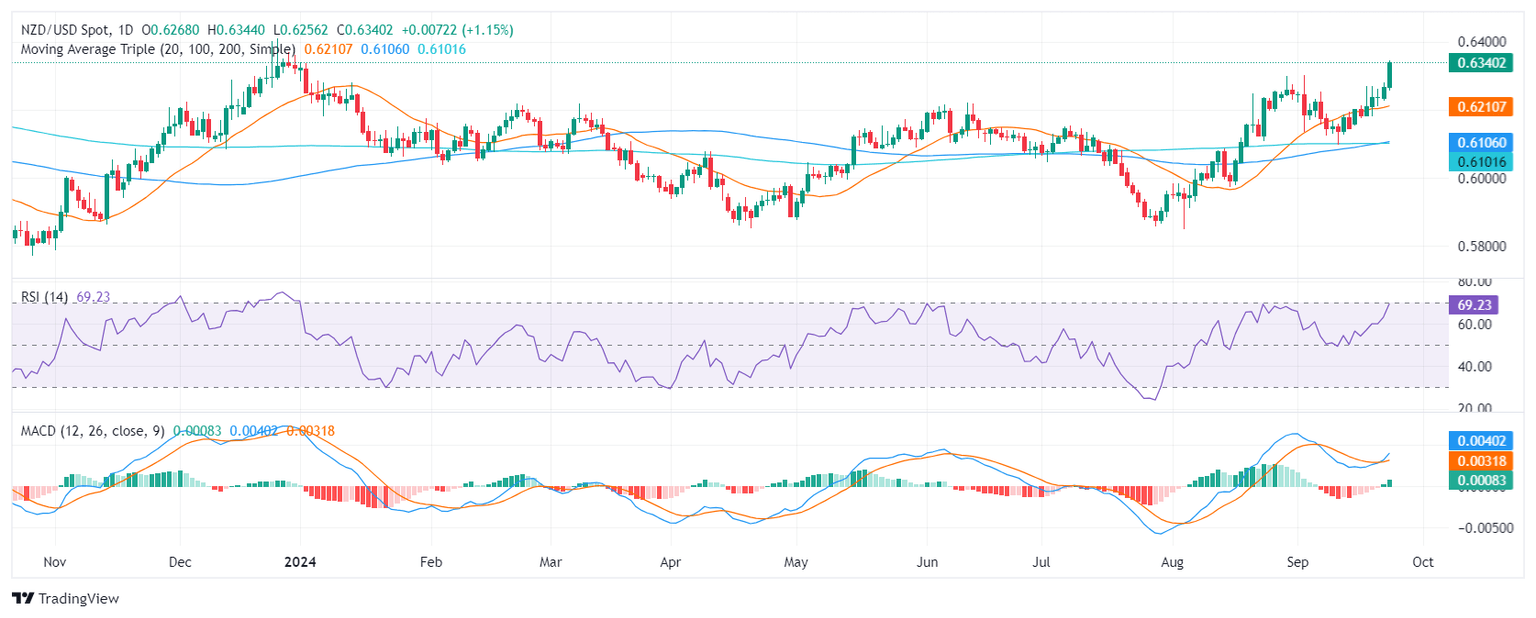 - The NZD/USD pair has risen sharply to trade at 0.6340, a 1% rise, suggesting strong buying pressure.