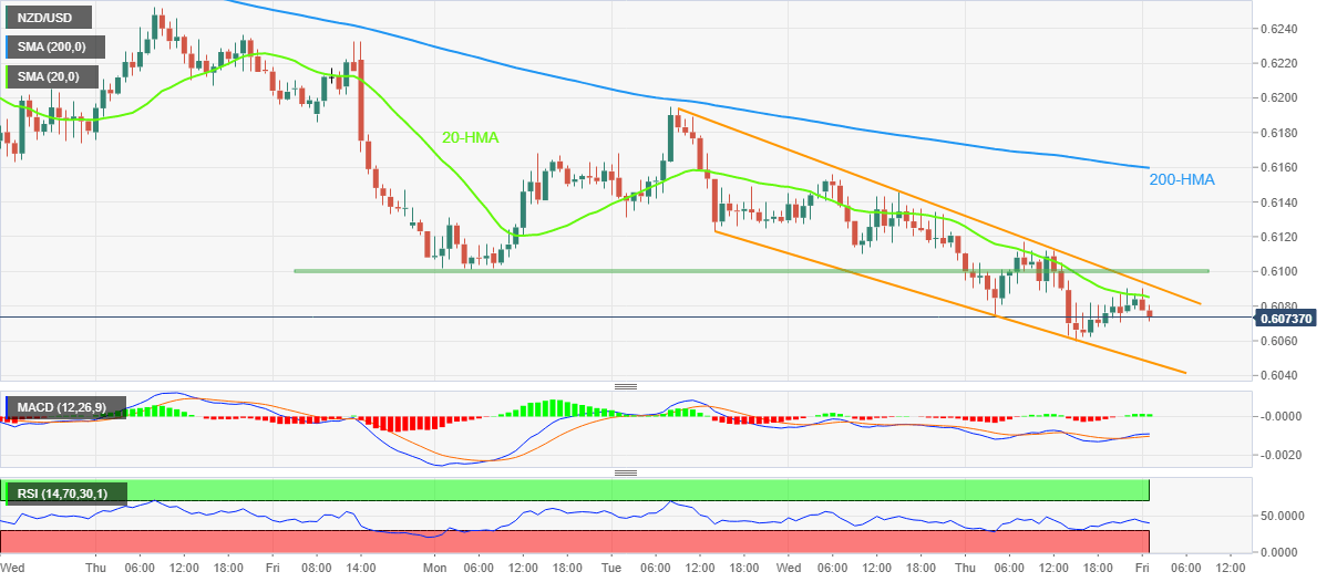 NZD/USD fades the early Asian session rebound as it retreats to 0.6070 on Friday. In doing so, the Kiwi pair portrays a pullback from the 20-HMA while staying inside a short-term bearish trend channel.