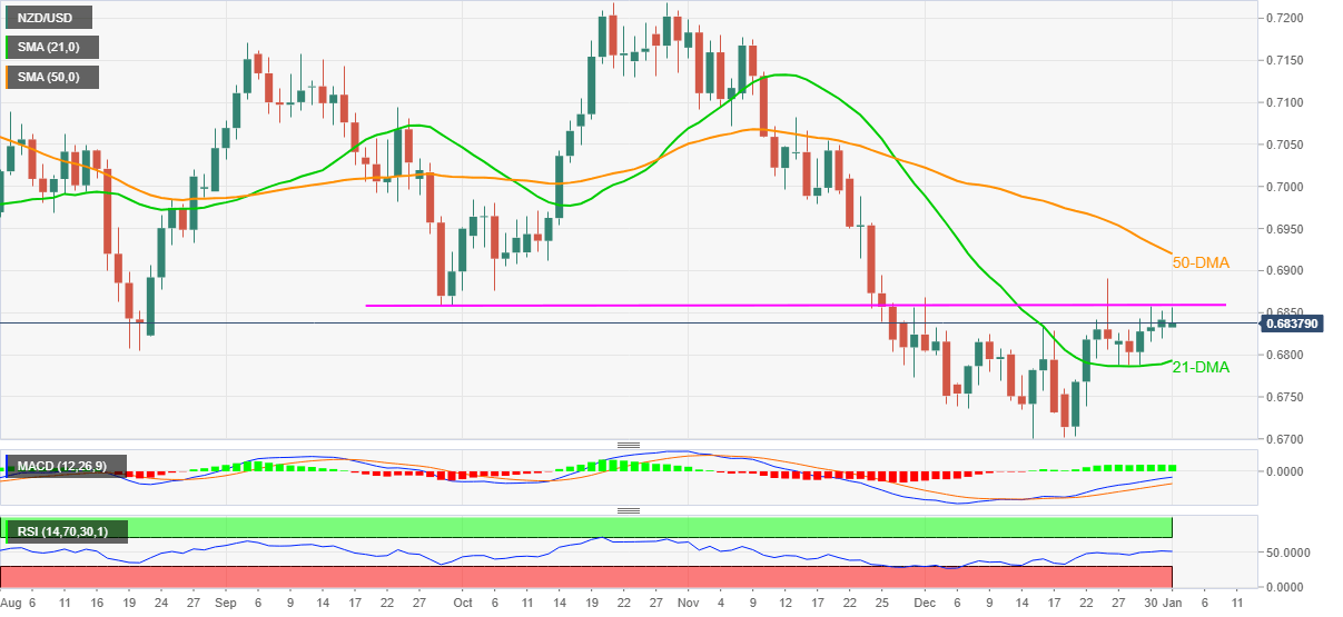 Even so, successful trading above 21-DMA joins the bullish MACD signals and firmer RSI line to keep NZD/USD buyers hopeful. However, a clear upside break of a three-month-old horizontal area near 0.6860 becomes necessary for the kiwi pair’s further upside.