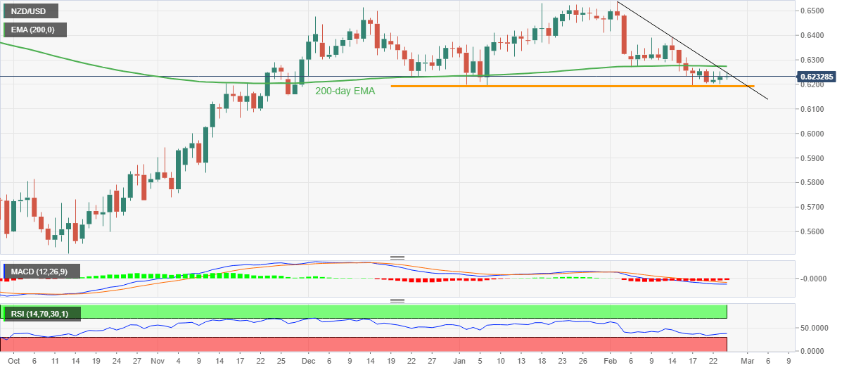NZD/USD remains defensive near 0.6230, struggling to extend the two-day winning streak during Friday’s Asian session. In doing so, the Kiwi pair grinds with an important trading range amid mixed oscillators.