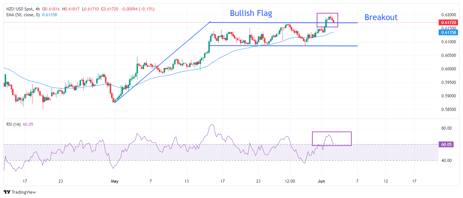 - NZD/USD tests the Bullish Flag breakout region near 0.6170
