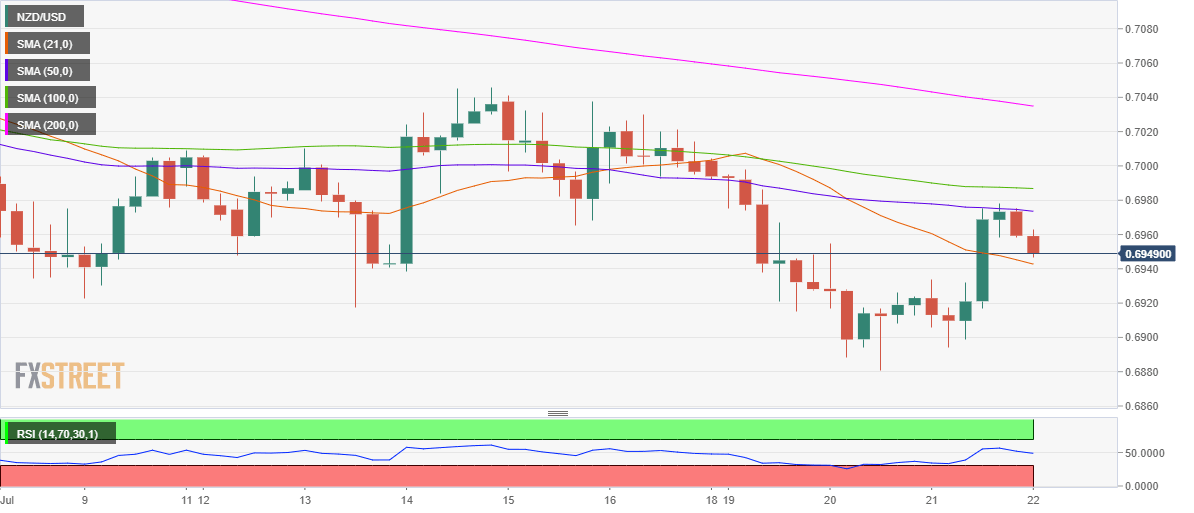 - NZD/USD faces rejection above 50-SMA resistance, drops below 0.6950.