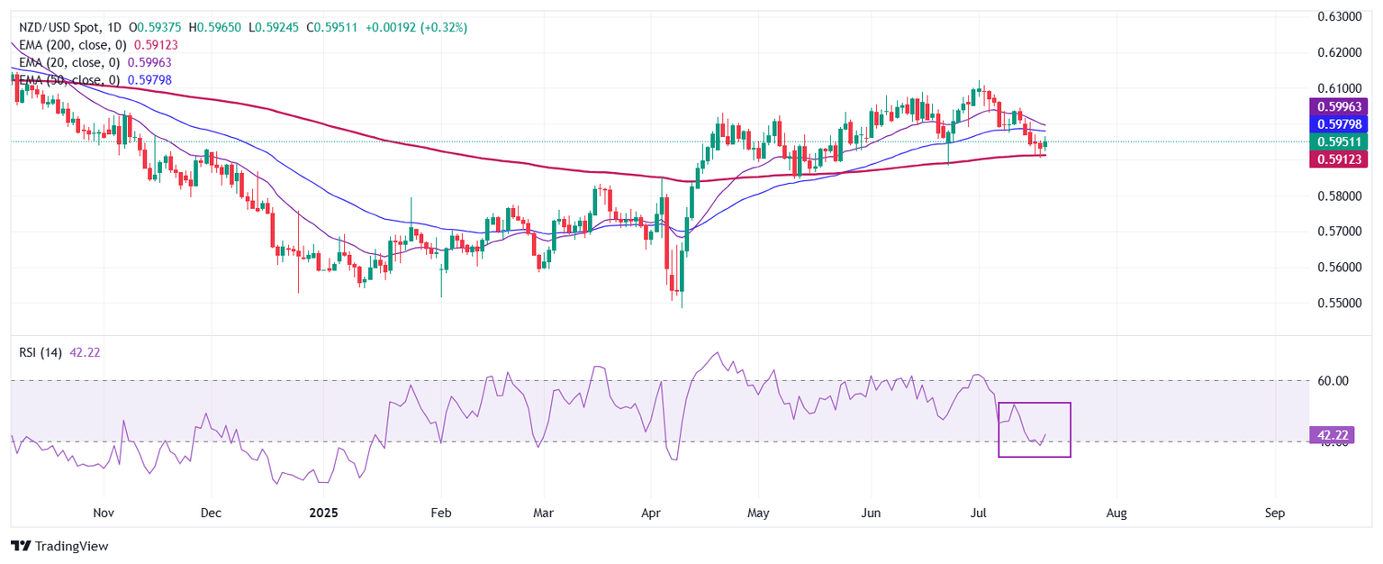 NZD/USD attracts bids near the 200-day Exponential Moving Average (EMA), which is around 0.5910. However, the overall trend remains bearish as the 20- and 50-day EMAs slope downwards.