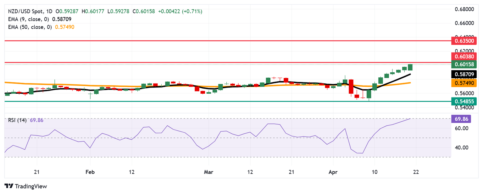 The NZD/USD pair extends its winning streak that began on April 9, trading around 0.6010 during early European trading hours on Thursday. Technical indicators on the daily chart point to a bullish bias, with the pair holding above the nine-day Exponential Moving Average (EMA).